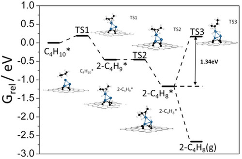 近年來(lái)劉洪陽(yáng)副研究員帶領(lǐng)的研究小組致力于新型納米碳材料負(fù)載金屬催化劑的設(shè)計(jì)與催化性能研究。經(jīng)過(guò)多年的學(xué)術(shù)積累,他們首次利用納米金剛石/石墨烯復(fù)合核殼材料(ND@G)為載體,制備出一種Sn輔助完全暴露的原子級(jí)分散Pt納米團(tuán)簇催化劑(a-PtSn/ND@G)。通過(guò)球差電鏡表征(圖1)并結(jié)合X射線吸收譜表征(圖2),構(gòu)建了平均三個(gè)Pt原子與富缺陷石墨烯載體配位成鍵的結(jié)構(gòu)模型。該催化劑在較低反應(yīng)溫度450 C下獲得良好的丁烷脫氫活性和穩(wěn)定性,TOF是傳統(tǒng)Pt3Sn合金催化劑的3.9倍,對(duì)烯烴產(chǎn)物的選擇性達(dá)到98%以上(圖3)。利用密度泛函理論(DFT)模擬計(jì)算研究發(fā)現(xiàn),原子級(jí)分散的全暴露Pt納米團(tuán)簇保證了Pt原子的充分利用以及產(chǎn)物烯烴分子的最佳吸附/脫附行為(圖4)。該項(xiàng)研究為開(kāi)發(fā)高效工業(yè)脫氫制烯烴催化劑提供了新思路,正與企業(yè)合作開(kāi)展進(jìn)一步的應(yīng)用研究。