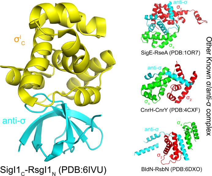 圖1. 新型 /抗 因子SigI/RsgI的復合物結構和已知的其他 /抗 因子的復合物結構完全不同。左圖為SigI/RsgI的結構,右圖為三種已知的其他 /抗 因子復合物的結構。