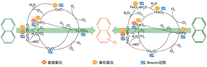 在本工作中,該團隊通過模擬焚燒煙氣反應氛圍,以萘為模式化合物,研究了焚燒煙氣中可能存在的Cu、Fe、Mn、Cr、Co、Ni、Al、Ti、Pb和Zn的氧化物和氯化物對芳構化和物親電氯化的影響,發現銅( 和 )和鐵( 和 )的氯化物是促進萘氯化的關鍵活性物質。結合銅鐵粒子晶型結構變化分析,首次揭示了煙氣中銅和鐵粒子通過脫氯-氧氯化循環驅動芳構化合物親電氯化的反應機制。氯化銅( )和氯化鐵( )可作為氯化劑直接誘導芳構化合物氯化。在銅粒子的脫氯-氧氯化循環中,由氯化銅( )誘導的直接氯化是芳構化合物氯化的主要機制;在鐵粒子的脫氯-氧氯化循環中,直接氯化和催化氯化發揮的作用相當。萘的親電氯化符合電子云密度函數理論,1和4位點優先發生氯取代反應。