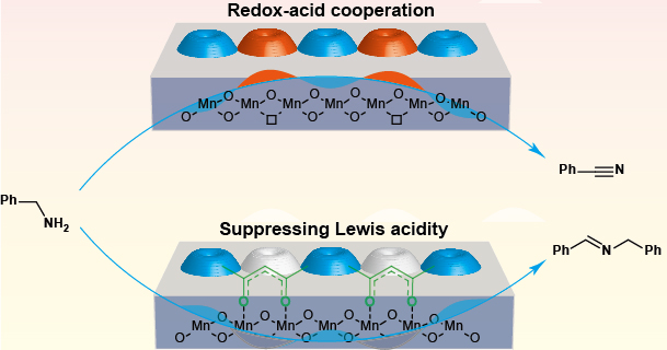 研究表明,通過不同結構的乙酰酮對錳氧化物表面進行修飾,可以調控錳氧化物表面的Lewis酸性。在催化氧化芐胺及其衍生物反應中,可分別實現高選擇性制備亞胺或腈:例如錳氧化物未經修飾時,催化氧化芐胺主要得到有機腈產物,收率為86.5%;當用乙酰丙酮對催化劑修飾時,主要氧化產物為亞胺,收率可達到90.6%。本工作利用乙酰酮類化合物的絡合能力,調變了錳氧化物表面Lewis酸性和催化氧化性能,對于深入理解金屬氧化物表面與有機胺選擇氧化的構效關系具有重要意義。