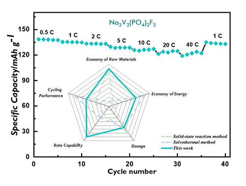 三氟磷酸釩鈉具有由[V2O8F3]雙八面體與[PO4]四面體間隔性的聯結形成的三維網狀結構,有利于Na+的快速嵌入和脫出。其理論能量密度為500Wh/kg,與LiFePO4在鋰離子電池中的能量密度相當(550Wh/kg),近年來備受關注。在前期研究工作基礎上,研究團隊提出了一種低溫溶劑熱-球磨制備方法,實現了高電導性碳包覆氟磷酸釩鈉(Na3V2(PO4)2F3)的綠色經濟合成。研究發現低溫溶劑熱過程中溶劑種類和pH值對Na3V2(PO4)2F3形貌和產物純度起到關鍵作用。在乙醇和水共混溶劑的酸性環境中,晶體具有很高的表面能,可以獲得高純度且高產率的Na3V2(PO4)2F3。與科琴黑(KB)短時間(1h)球磨之后,Na3V2(PO4)2F3表面均勻包覆了一層高度石墨化的KB,有效提高了其離子擴散和電子傳導能力。由Na3V2(PO4)2F3組裝的鈉離子電池在0.5C的電流下具有138mAh/g的高比容量,在40C的大電流下其容量仍能維持122mAh/g。該低溫溶劑熱-球磨方法將為低成本、高性能鈉離子電池技術的實用化提供一種新的策略。