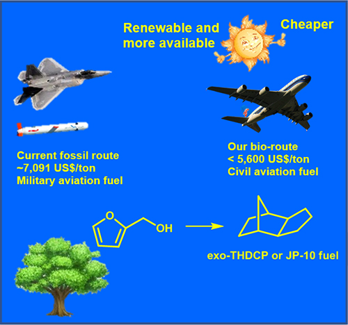 糠醇是農林廢棄物中半纖維素部分獲得的一種重要的化學品,迄今已有幾十年的工業化生產歷史。該工作開發了兩條以糠醇為原料合成JP-10燃料的新路線,可獲得大約65%的收率(以碳計算)。經過初步的經濟分析,該生物質路線獲得的bio-JP-10的成本低于5600美元/噸。根據國外文獻報道,未來糠醇的價格有望降至400美元/噸左右,屆時JP-10的成本將可降低至2900美元/噸以下,有望實現生物質JP-10的實際應用。