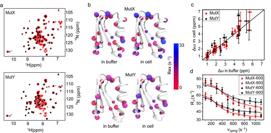 圖1. GB3突變體 MutX和MutY在細胞內和水溶液的折疊與解折疊構象交換動力學的比較