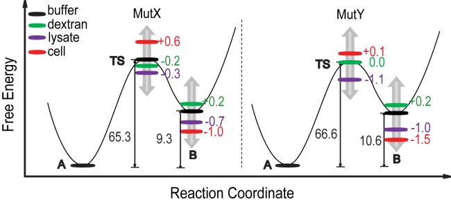 近日,青島能源所姚禮山研究員帶領的蛋白質設計研究組在細胞內蛋白質折疊研究方面取得新進展。該研究以IgG結合蛋白質GB3的兩個突變體MutX 和 MutY(圖1)為研究體系,采用核磁共振技術,對其在細胞內的折疊態(tài)與解折疊態(tài)之間的構象交換進行了表征。結果表明蛋白在細胞內和緩沖溶液中的折疊和解折疊的動力學過程有較大差異(圖1),折疊態(tài)、解折疊態(tài)和過渡態(tài)的相對自由能受到了細胞環(huán)境的影響(圖2)。進一步研究表明,這一影響主要來自于細胞內的五級作用力,但這種作用力不足以改變蛋白質的折疊態(tài)和解折疊態(tài)的構象。該研究結果也表明離體條件下的蛋白質功能研究需要在細胞環(huán)境中進行獨立驗證。相關研究已發(fā)表于Journal of the American Chemical Society雜志上(JACS 2019, DOI: 10.1021/jacs.9b04435)。