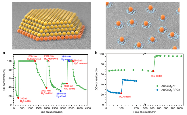 可還原氧化物負載金催化劑上CO氧化是典型的界面催化反應之一。本研究發現,對于Au1/CeO2單原子催化劑上的CO氧化反應,少量水的加入能大幅度提高反應活性,反應速率可提升兩個數量級;而在Au/CeO2納米顆粒催化劑上,水促進作用較弱,反應速率提升不超過3倍。DFT計算結合原位紅外表征發現,在不加水條件下,單原子與納米顆粒催化劑均遵循氧化還原(Redox)機理,但是載體表面的羥基會抑制單原子催化劑的晶格氧反應活性;而當反應體系中引入水,單原子催化劑上的CO氧化可以按照CO+OH的反應途徑高效進行,活性遠高于Redox反應途徑。而納米催化劑界面處有無水的存在均以Redox機理為主,因此水的存在對催化反應性能影響較小。進一步DFT計算分析發現,單原子和界面位點上水的不同影響主要源于其不同的微環境結構與電子性質:單原子催化劑中Au原子全部與載體O原子相連,因而具有更高化學價( +),并且在反應過程中可變價,因此可以開辟新的反應途徑(CO+OH);而在納米催化界面處,Au原子除與載體作用外,還與其它Au原子相連,使其電荷被平均化,因而以近零價存在,并且在反應過程中不能發生化合價變化,因此反應不能按照新的途徑進行。