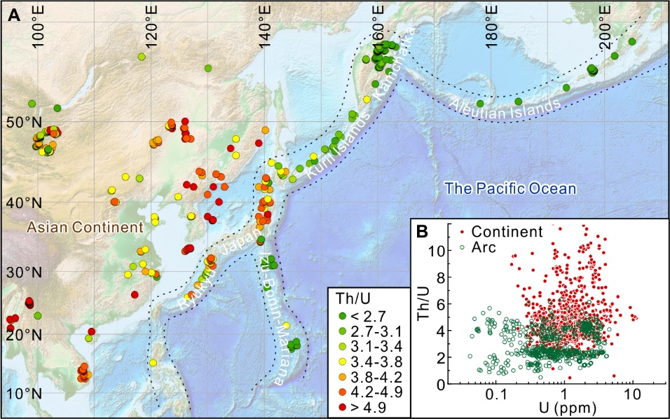 孫衛東研究員指導其博士后劉鶴,聯合國外科學家以全新手段和視角對全球性氧化事件的發生時間進行了限定。研究發現,在當今地球上,形成于阿留申群島、堪察加半島、千島島弧、日本群島和琉球群島的弧巖漿巖中Th元素含量和U元素含量的比值(Th/U)明顯低于亞洲東部的內陸型巖漿巖。Th和U是地球化學性質十分相近的兩種元素,因此不同巖性的巖漿巖中的平均Th/U基本保持一致?;r漿巖具有低Th/U的原因是在大氣和海水中氧氣的氧化作用下,地表河流和海水中的U元素主要以溶于水的U6+形式存在,但Th元素仍以不溶于水的Th4+形式存在,致使現代海水中的U元素含量遠高于Th元素含量,從而造成蝕變的海底洋殼具有低Th/U。這些蝕變洋殼在沿俯沖帶向深部俯沖過程中,通過洋殼脫水等作用將其低Th/U的特征隨著流體運移最終帶入到俯沖帶上方形成的弧巖漿巖中。