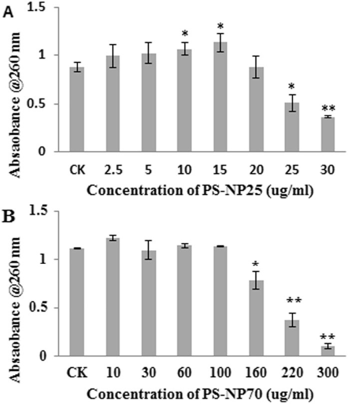 圖1. 不同濃度聚苯乙烯納米微球對對A549細胞活力的影響