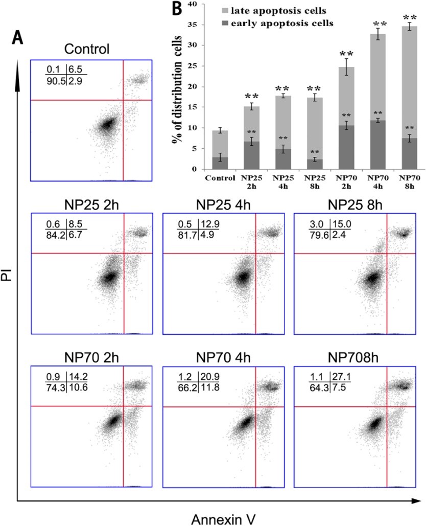 圖2. 通過流式細胞儀觀察到聚苯乙烯納米微球可以誘導A549細胞產生凋亡現象
