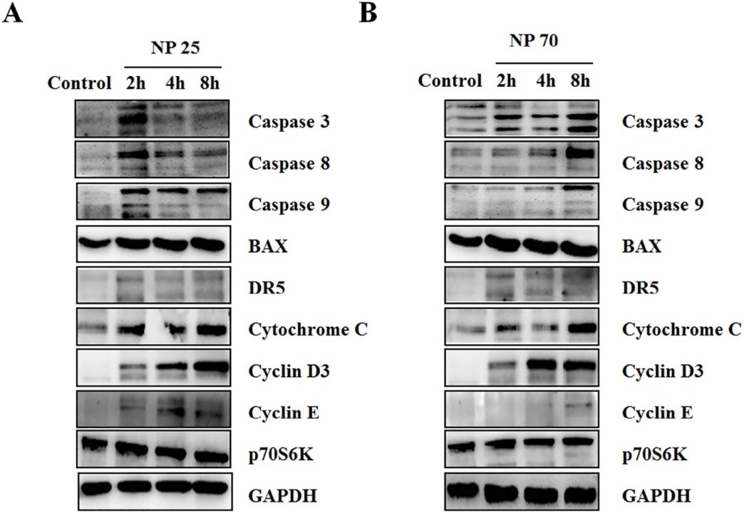 圖3. 聚苯乙烯納米微球可以改變A549細胞中細胞周期表達和凋亡調控相關蛋白