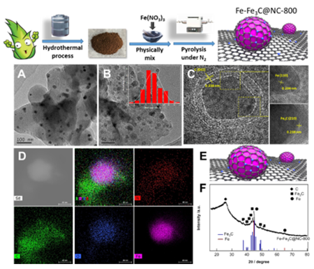 圖1. 催化劑Fe-Fe3C@NC的制備和HR-TEM, HAADF-STEM, XRD表征圖。