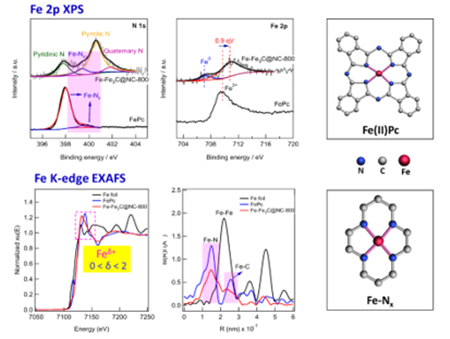 圖2. 催化劑Fe-Fe3C@NC-800 Fe 2p XPS和Fe K-edge EXAFS譜圖。