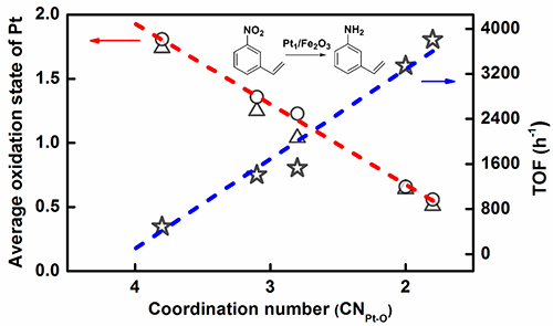 在前期研究工作的基礎上(Nat.Commun.,2014;Chem. Sci.,2017;J. Am. Chem. Soc.,2017),王愛琴和張濤團隊通過創新催化劑制備方法,發展了一種乙二胺絡合-惰性氣氛快速熱處理制備單原子催化劑的方法,不僅獲得了較高負載量單原子Pt1/Fe2O3-T(T:500 C-600 C)催化劑,而且通過調節快速熱處理溫度可以在不改變Pt單原子分散的前提下,精細調控單原子Pt中心的配位環境:熱解溫度越高,單原子Pt中心的Pt-O配位數越低。科研人員進一步將單原子Pt中心的第一殼層Pt-O的配位數作為預測Pt活性中心的電子狀態以及催化加氫活性的描述符:Pt-O的配位數越低,Pt的平均氧化態越低,催化劑的加氫活性則越高。這種活性金屬中心配位環境的可調性使單原子催化劑成為連接均相催化和多相催化之間的橋梁,為設計兼具高活性與高選擇性的加氫催化劑開辟了新途徑。