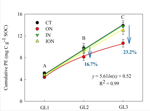 圖1. 氮沉降形態及外源碳輸入量對激發效應的影響。
