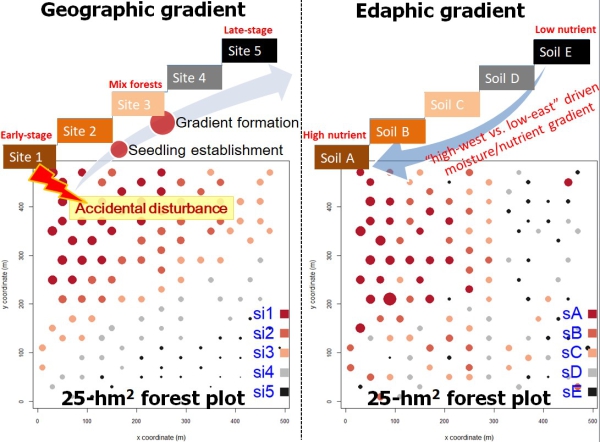 鑒于此,中國科學(xué)院沈陽應(yīng)用生態(tài)研究所生物多樣性組(菌物)與天然林生態(tài)組以長白山25 hm2針-闊混林樣地為依托,利用ECM真菌相關(guān)25個(gè)環(huán)境因子量化出地理分布、土壤理化性質(zhì)和植被功能特性等三類綜合因子和環(huán)境質(zhì)量梯度,并藉此探究植被-ECM在上述環(huán)境梯度上的空間分布特征及其形成機(jī)制,揭示不同環(huán)境梯度與ECM真菌互作關(guān)系,明確影響ECM真菌組成與分布的關(guān)鍵驅(qū)動因子。