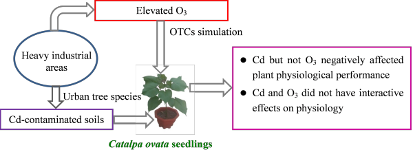 該研究組利用中科院沈陽樹木園氣候控制實驗平臺,開展了我國北方城市常見行道樹種梓樹(Catalpa ovata,俗稱“北方梧桐”,一種重要的城市綠化和造林速生樹種)對臭氧及土壤重金屬復合污染的生理生態響應研究(圖1)。結果表明:高濃度臭氧對梓樹生長及抗性生理代謝無顯著影響,證實了梓樹具有較高的耐臭氧能力,而土壤鎘添加顯著抑制了該樹種生長并對其生理代謝包括礦物營養元素含量變化產生顯著影響,表明梓樹對土壤鎘污染比臭氧更敏感,同時發現兩種污染物復合對該樹種生長等影響無顯著交互作用,這與前不久該團隊研究的結論(二者對臭氧敏感樹種楊樹影響存在顯著交互作用---Ecotoxicology and Environmental Safety,2019,174:35-42)相反,進一步表明了樹木對臭氧和重金屬及二者復合響應與敏感性存在顯著種間差異,不同樹種對兩種污染物的復合響應可能存在不同的生理代謝或分子應答機制。這些研究結果可為我國應對氣候變化和區域環境污染的樹種選擇及土壤生態修復等方面提供重要科學依據。
