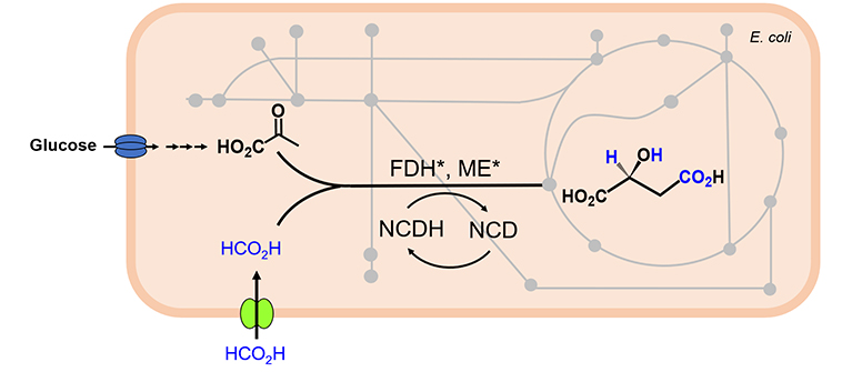 本研究通過定向進化獲得非天然輔酶煙酰胺胞嘧啶二核苷酸(NCD)偏好型甲酸脫氫酶(FDH*),在純酶水平耦聯NCD偏好型蘋果酸酶突變體(ME*),構建了新的正交氧化還原體系,證明其可利用甲酸來源的碳和還原力進行丙酮酸還原羧化;進一步在微生物細胞內構建甲酸驅動、NCD介導的蘋果酸生物合成體系。該研究逆轉了胞內蘋果酸節點的代謝流方向,對人工設計代謝途徑、選擇性調控細胞物質能量代謝具有重要參考價值。