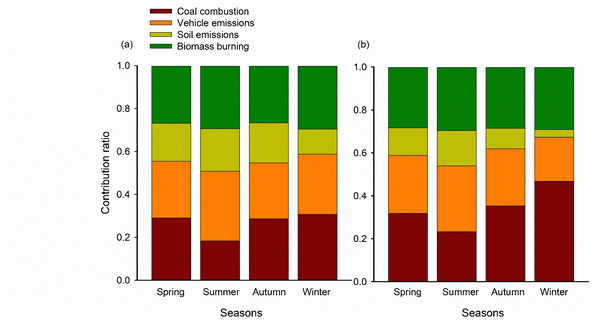中國科學院沈陽應用生態研究所穩定性同位素研究團隊,以東北區域典型氮污染城市沈陽為例,通過測定降水中硝酸鹽含量和 15N的季節性變化進而探究影響大氣硝酸鹽 15N的主要因素,并重點探討了源解析過程中是否要考慮NO和NO2轉化過程 (NOx循環) 中的同位素分餾作用。研究結果表明:從2016-2017年,沈陽總無機氮沉降量為19.8 kg N ha-1 a-1,其中硝態氮為10.5 kg N ha-1 a-1,銨態氮為 9.3 kg N ha-1 a-1,夏季沉降量明顯高于冬季; 15N-NO3-的均值為0.9 4.0‰,且冬季高夏季低,變化范圍為-4.9‰到8.3‰(圖1)。比對結果表明大氣硝酸鹽形成過程中NOx循環導致的分餾作用對 15N-NO3-的影響可以忽略,煤燃燒和土壤排放的季節性差異是導致 15N-NO3-冬季高夏季低的主要原因(圖2)。煤燃燒和汽車尾氣對大氣NOx貢獻占54-67%(圖2b)。