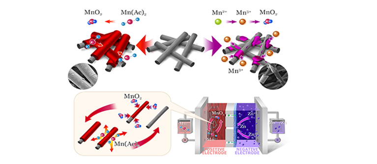 錳基電池因資源儲量豐富、成本低廉以及環境友好等優勢受到廣泛關注。但循環穩定性差等問題一直制約著錳基電池的發展。該團隊提出的錳基電對以Mn(Ac)2作為活性物質,由于Ac-的配位作用,在充電過程中,Mn(Ac)2通過氧化反應以MnO2的形式沉積在電極上,在放電過程中溶解為Mn(Ac)2;與其它錳鹽(MnSO4或MnCl2)部分或者全部生成Mn3+的機理完全不同,該反應可以完全避免Mn3+的歧化副反應問題,從而大大提高了電對的穩定性和可逆性。