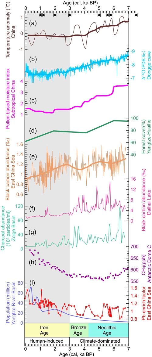 研究結果顯示,7千年-3千年之間,火與溫度、降水在千年和百年尺度均呈密切正相關,表現為暖濕期火活動更多,冷干期火明顯減少,表明氣候對區域火的主控地位。但是,在3千年以來,火與氣候的關系在多種時間尺度均發生重要轉變,暗示3千年以來人類活動對長江流域火活動的影響超過自然因素。在千年時間尺度,溫度和降水在3千年-1千年基本穩定,僅過去1千年來稍有增強,而長江流域火活動在3千年以來長期逐漸減弱,重金屬元素Pb、Cu含量則相應顯著升高,暗示3千年來人類活動(如種植農業、金屬冶煉)的持續增強,使流域森林覆蓋率(燃料量)降低而限制了火的發生,從而改變了之前火-自然之間的固有關系。在百年時間尺度上(3千年以來),所識別出的六次火活躍期均發生在相對寒冷干旱的時期,并明顯與中國歷史上從北方黃河流域向長江流域的數次人口南遷時期相對應,指示人類因素對火的干擾增強。考古和氣候研究表明,長期干旱、寒冷的氣候更易導致饑荒、戰爭和人口遷移。北方人口的南遷及其帶來的更新的農耕技術進一步促進了長江流域人類活動的增強和短期火的頻繁發生。