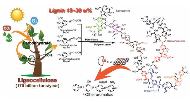 木質素約占木質纖維素總質量的15%至30%,其結構中含有豐富的官能團化芳香結構,可以作為制備芳香化學品的原料。然而,木質素因為其結構中存在穩定的醚氧鍵、碳碳鍵以及復雜的連接方式,其高效催化解聚為收率可觀的芳香單體至今仍然是一項具有挑戰性的工作。