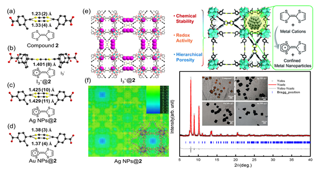 該團隊提出了一種NP@MOF多功能復合材料精準分級制備新策略。利用四硫富瓦烯四苯羧酸(H4TTFTB)和甲基化的四硫富瓦烯四苯羧酸(Me-H4TTFTB)與ZrCl4在溶劑熱條件下自組裝,獲得了基于Zr6節點簇的穩定三維Zr-MOFs材料[Zr6(TTFTB)2O8(OH2)8](1)和[Zr6(Me-TTFTB)1.5O4(OH)4(COO)4](2)(以下簡稱Zr-MOF(2))。通過上海光源同步輻射衍射線站和高分辨粉末衍射線站,準確測定并解析其相關三維拓撲結構。