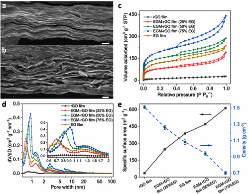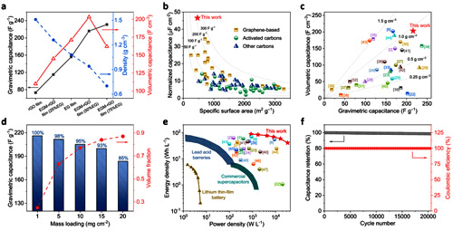 電化學電容器具有可快速充電、功率高、循環壽命長、工作溫度范圍寬、安全性能高等優點,可用作大功率電源,在混合電動汽車、備用電源、便攜式電子設備等領域都具有廣闊的發展前景。然而電化學電容器相比于電池其能量密度較低,即單位體積內儲存的能量低,限制了其更廣泛的應用范圍,尤其是在便攜式智能設備中的應用, 需要進一步提高體積能量密度。近日,金屬研究所與英國倫敦大學學院合作,在《自然-能源》(Nature Energy) 在線發表題為“可調層間距、高效孔利用石墨烯薄膜的電化學電容儲能研究”(Tuning the interlayer spacing of graphene laminate films for efficient pore-utilization towards compact capacitive energy storage )的研究論文。