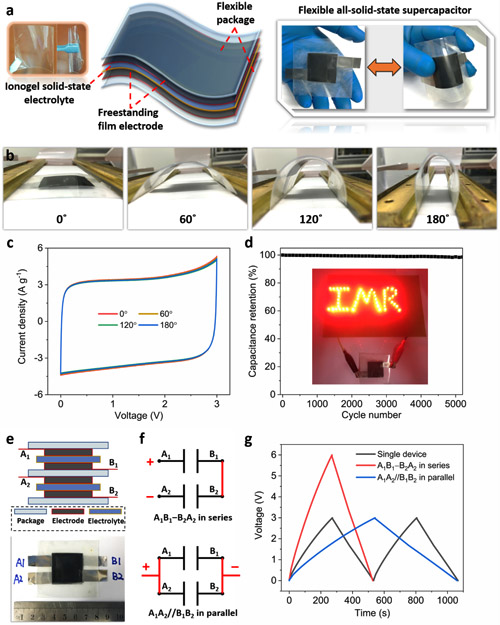 研究人員制備了不同比例的氧化石墨烯和熱膨脹還原石墨烯的混合溶液,經過真空抽濾,得到片層間距可調節的復合石墨烯基薄膜。通過調控片層間距,實現了優化整個電極材料孔隙率的效果。當電極材料的孔隙尺寸與電解液的離子尺寸相匹配時,孔隙的空間利用達到了最優化,從而極大化了體積能量密度。在此基礎上,科研人員設計了全固態柔性電化學電容器,石墨烯薄膜電極材料本身良好的彎折性能,保證了整個器件的柔性,并進一步發展了智能器件,通過根據實際需求改變電路連接方式,實現了不同的輸出效果。