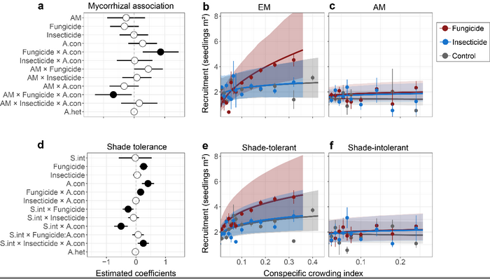 鑒于此,中國(guó)科學(xué)院沈陽(yáng)應(yīng)用生態(tài)研究所天然林生態(tài)組已畢業(yè)博士賈仕宏,在導(dǎo)師王緒高研究員的指導(dǎo)下,與美國(guó)康涅狄格大學(xué)Robert Bagchi博士合作,于2014年在長(zhǎng)白山闊葉紅松林建立了控制實(shí)驗(yàn)樣地,通過(guò)圍欄及定期噴施殺菌劑和殺蟲(chóng)劑等處理研究大型動(dòng)物、昆蟲(chóng)和病原菌對(duì)喬木幼苗的影響(圖1)。結(jié)果發(fā)現(xiàn),在群落水平上殺菌處理顯著降低了大樹(shù)周?chē)N幼苗的增補(bǔ)和存活,殺蟲(chóng)也增加了大樹(shù)周?chē)N幼苗的增補(bǔ),但對(duì)存活無(wú)顯著影響,圍欄處理對(duì)幼苗增補(bǔ)和存活均無(wú)顯著影響。說(shuō)明病原真菌和昆蟲(chóng)通過(guò)密度制約的方式抑制同種的定植,為其他種提供生存空間,進(jìn)而促進(jìn)物種共存。同時(shí)為進(jìn)一步研究不同樹(shù)種受病原真菌和昆蟲(chóng)影響的規(guī)律,按菌根類(lèi)型和耐蔭性將幼苗分為外生菌根和叢枝菌根,及耐蔭種和非耐蔭種兩大類(lèi),發(fā)現(xiàn)殺菌處理主要影響外生菌根樹(shù)種和耐蔭樹(shù)種大樹(shù)周?chē)N幼苗的增補(bǔ),而殺蟲(chóng)則主要影響非耐蔭樹(shù)種大樹(shù)周?chē)挠酌缭鲅a(bǔ)(圖2)。