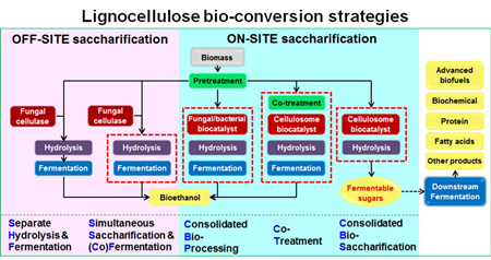 與目前已知的其他木質纖維素生物轉化策略相比,CBS策略一方面采取類似于“整合生物加工(簡稱CBP)”的方式將酶的生產與水解步驟有機整合,因此與其他策略相比,在用酶成本方面具有優勢;另一方面將下游發酵步驟進行一定程度上的分立,并將可發酵糖用作下游發酵中的平臺化學品,與CBP相比具有顯著的產品出口靈活性(圖1)。該研究組研究人員前期已成功構建了高效的CBS全菌催化劑,優化了糖化過程以降低生產成本并縮短了過程,并且通過偶聯預處理工藝和下游應用技術初步建立了基于CBS工藝的整個木質纖維素生物轉化途徑,在實驗室小試水平完成了CBS工藝開發。