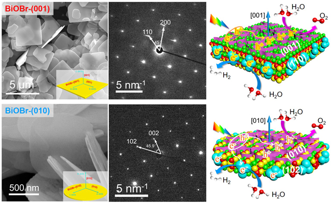 雖然半導體光催化材料的形貌和晶面調控被證明是提高光催化性能的有效途徑之一,但關于形貌和晶面如何影響光催化性能仍然眾說紛紜,研究人員往往將光催化活性的差異歸結于所謂的高活性晶面,但對于活性晶面本質的認識并不清楚。本工作中,研究團隊基于前期對晶面間光生電荷分離的研究基礎,以典型的氧溴化鉍(BiOBr)半導體為研究模型,分別可控合成了兩種具有特定晶面的BiOBr納米晶。研究發現,具有特定晶面暴露的納米晶的光催化活性差異并不直接與高暴露比例的晶面性質關聯,而是和與之共同暴露的晶面性質密切相關,這些與之共存的晶面暴露比例雖小,但其存在真正決定了高暴露比例晶面在光催化反應中所表現出來的性質。由于低暴露比例晶面和高暴露比例晶面表面能帶彎曲程度的差異會誘導光生電荷在不同晶面之間發生空間分離,且由于共存晶面的不同導致晶面間光生電荷分離性質的差異,直接影響了納米晶在光催化反應中表現出不同的催化性能。該研究工作進一步澄清了半導體光催化劑晶面依賴的光催化反應的本質,對于深入理解半導體納米光催化劑的光生電荷分離和催化反應機制具有重要的科學價值。
