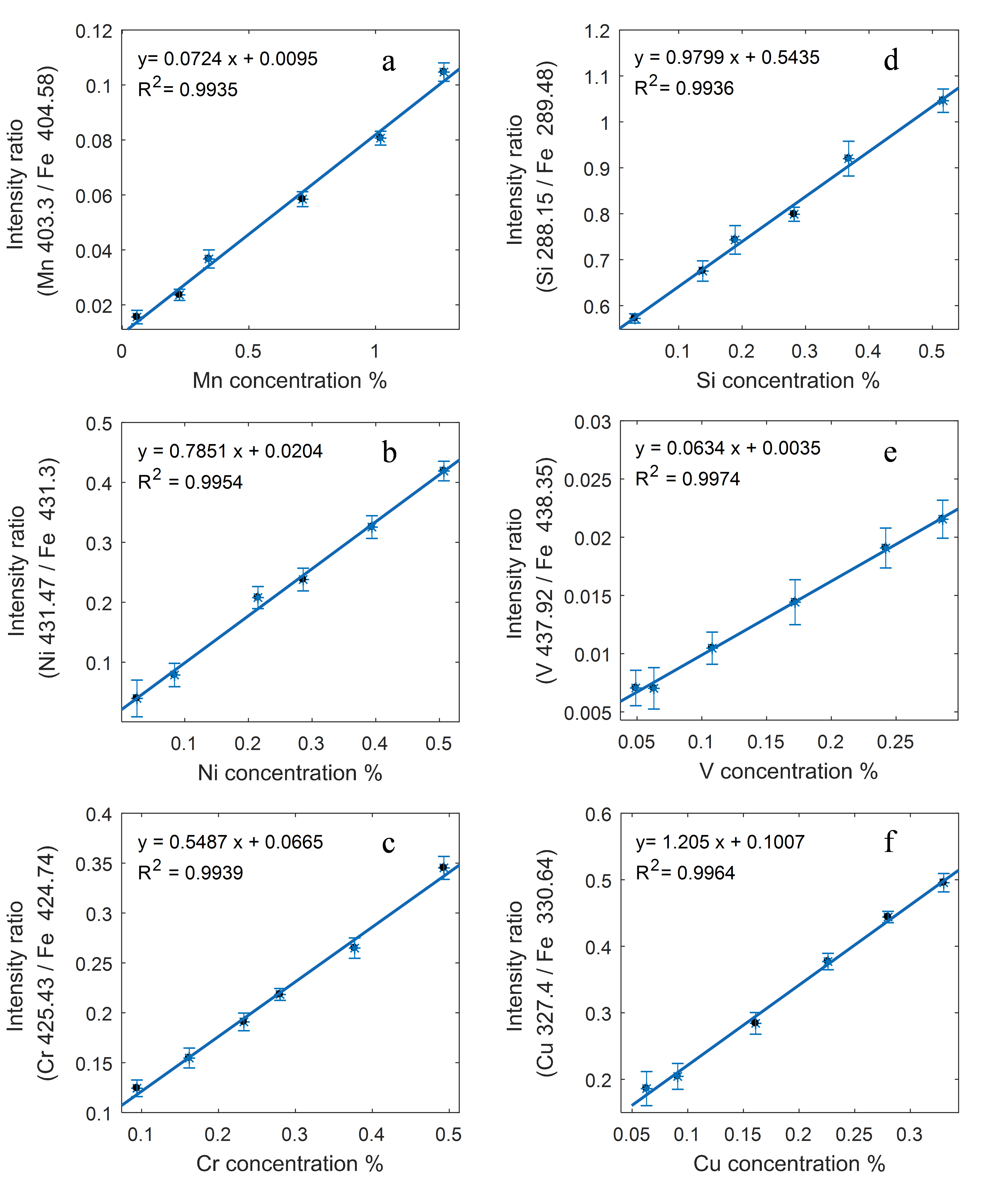 金屬工件在使用過程中不可避免的相互摩擦,使得表面粗糙度增大,而傳統的無損檢測方法需要復雜的樣品前處理,檢測速度慢,且無法實現原位檢測,而LIBS技術能彌補其不足。沈陽自動化所LIBS團隊對樣品表面粗糙度在0.03-0.5 m之間的6塊碳鋼進行了掃描分析。在激光燒蝕彈坑約10 m的情況下,通過優化在不同粗糙度樣品下采集光譜時燒蝕彈坑的重疊率,該研究發現當激光燒蝕彈坑重疊率為75%時,光譜穩定性最好。且在混合粗糙度樣品的情況下進行定量分析時,采用一次函數對于對碳鋼中Cr, Cu, Mn等元素進行擬合,所得的擬合曲線的決定系數都高于0.993。該結果表明,LIBS無損檢測方法能直接對樣品表面粗糙度不同的樣品進行分析。相關成果已發表在Journal of Analytical Atomic Spectrometry期刊上。