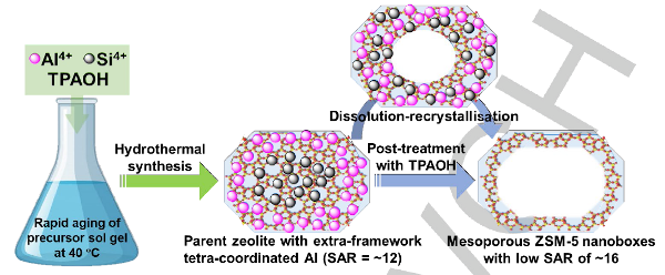 ZSM-5型沸石由于其微孔結構(0.51-0.56 nm)和可調變的固體酸特性,在石油裂解、石化產品精制方面發揮著至關重要的作用。由于沸石微孔限制反應物傳質,近幾十年以來研究重點一直是提高反應物對沸石酸性位的可接觸性以提高其催化活性。通常采用堿液后處理選擇性脫硅刻蝕出晶內介孔來提高沸石酸性位的可接觸性。但是由于沸石母相中四配位鋁對脫硅起抑制作用,這種方法只適用于合成硅鋁比較高的ZSM-5型沸石,合成具有良好可接觸性的低硅鋁比ZSM-5型沸石仍是一個具有挑戰性的課題。