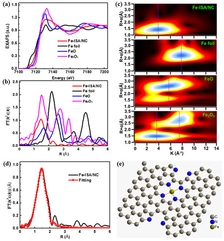 圖2 Fe-ISA/NC催化劑的XAFS表征及結構模型。
