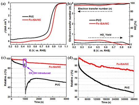 圖3 Fe-ISA/NC催化劑在堿性溶液中氧還原催化性能評(píng)價(jià)。