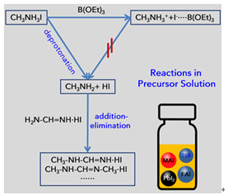 發現問題的目的是為了解決這一問題,研究人員隨之引入硼酸三乙酯到溶液中,利用硼的空軌道與碘化甲胺的碘離子相互作用,限制其去質子化,從而有效限制了進一步與碘化甲脒的加成-消除反應,達到了提高鈣鈦礦前驅體溶液穩定性的目的。硼酸三乙酯是一種常用的低沸點溶劑,在后續薄膜的加熱過程中可以完全揮發,不會在鈣鈦礦薄膜中殘留,這對制備高質量鈣鈦礦薄膜是尤為重要的。
