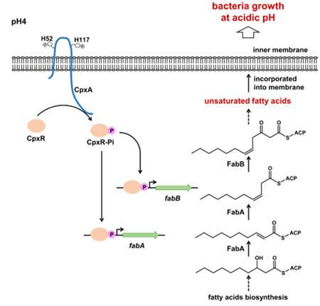 近日,青島能源所咸漠和趙廣研究組發現了一種大腸桿菌酸耐受性新機制,可以保證細菌在酸性環境下的正常生長。研究發現傳感激酶CpxA可以通過組氨酸殘基的質子化直接感應酸性環境,并激活其配對的調控蛋白CpxR來啟動不飽和脂肪酸合成基因fabA和fabB的表達,最終提高細胞膜磷脂中不飽和脂肪酸的比例。細胞膜磷脂成分的變化會降低細胞膜的流動性和質子通透性,從而維持大腸桿菌細胞內部的pH不會受外界酸性環境的影響。小鼠體內實驗結果證明,缺失了這種酸耐受性系統的大腸桿菌突變菌株在小鼠腸道內的生長受到顯著抑制。除大腸桿菌外,這種酸耐受性系統還在傷寒沙門氏菌、志賀氏菌、霍亂弧菌、鼠疫耶爾森氏菌、綠膿假單胞菌等多種致病菌中廣泛存在,有可能作為開發新抗菌藥物的靶標。