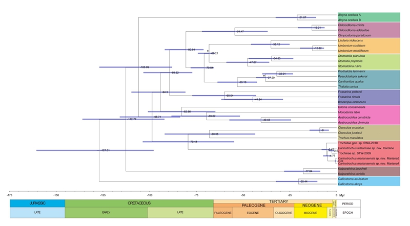 研究團隊對海洋所歷次海山航次采集的腹足類標本進行整理分類時發現了這兩種形態特征獨特的馬蹄螺,標本分別采自馬里亞納海山(水深865m)和卡羅琳海山(水深1332m)。研究發現,兩者無論是在貝殼形態、齒舌特征以及軟體部分的解剖特征方面,均與已知的馬蹄螺科種類存在明顯差別。為進一步確認其分類地位,研究人員利用多基因聯合建樹的方法對馬蹄螺科進行了系統發育分析。結果顯示,它們并沒有與馬蹄螺科中任何已知的亞科聚在一起,而是單獨聚成一支。基于上述研究,將這兩種馬蹄螺分別命名為馬里肋馬蹄螺Carinotrochus marianaensis Zhang S.Q., Zhang J.L. & Zhang S.P., 2020和威氏肋馬蹄螺Carinotrochus williamsae Zhang S.Q., Zhang J.L. & Zhang S.P., 2020,并為此建立了1個新亞科肋馬蹄螺亞科Carinotrochinae及1新屬肋馬蹄螺屬Carinotrochus。其中,馬里肋馬蹄螺生活在竹珊瑚上,以其上附著的水螅為食。通過化石年代標定與分子鐘分析推測,該類群可能是于晚白堊紀時期(距今約8千萬年)由淺海向深海擴散。據推測,該類群的進化擴散路徑可能與一些底層洋流驅動的幼蟲擴散密切相關。另外,基于分子數據分析,目前這個新屬在西南太平洋還可能存在另外兩個未經描述的新種。