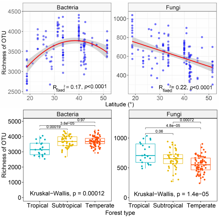 生物多樣性的起源和維持機制一直以來都是生態學領域亟待解決的重要研究課題。大量證據顯示地球上大型動植物的多樣性會隨著緯度的升高而降低,但是到目前為止并沒有可靠的證據能夠支持土壤微生物多樣性是否也遵循這樣的規律。甚至有些研究基于特定的的緯度范圍發現微生物多樣性可能與緯度之間根本不存在線性關系。此外由于細菌和真菌在個體大小、生長策略及生態功能上的差異,細菌和真菌的維度多樣性變化是否存在差異及其背后的機制仍然不夠明確。