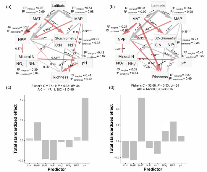 圖 2. 環境因子對中國東部森林土壤微生物多樣性分布影響的PiecewiseSEM擬合結果.(a),(b)分別表示細菌和真菌的豐富度的邏輯結構擬合結果. (c),(d)分別表示環境因子對細菌和真菌緯度多樣性變化的標準總效應.