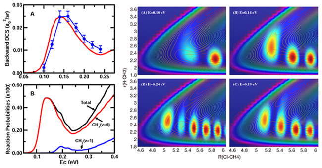 理論分析表明,J=0反應幾率上的峰不是由反應共振,而是由體系的重-輕-重特性所引起的,因此該反應在反應幾率上存在重-輕-重振蕩現象。這個反應幾率上的振蕩峰,在后向散射微分截面隨碰撞能變化關系上造成幾乎一樣的振蕩峰,可以被實驗觀測到。進一步的理論研究發現,在Cl與CH4碰撞過程中,不反應的CH3基團在一定程度上阻止了反應CH鍵的轉動,使CH鍵不會像在三原子反應中那樣從共線構型快速轉離,從而給予Cl-H-CH3更多的時間保留共線構型,獲得比三原子重-輕-重反應更大的反應性,使這個多原子反應中的重-輕-重振蕩能被實驗觀察到。