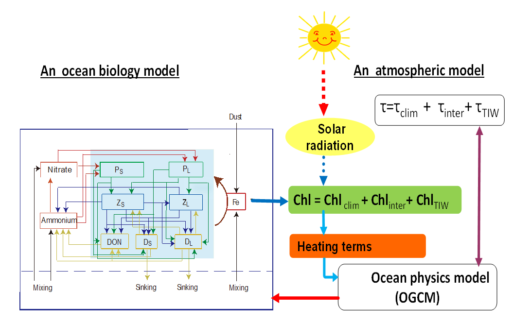 一個混合型耦合模式HCM-AOCB示意圖(表征熱帶太平洋大氣和海洋環流-生物地球化學(AOCB)間相互作用)