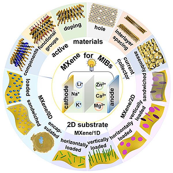 基于前期研究基礎,該團隊系統地綜述了MXene基納米結構在高性能金屬(鋰、鈉、鉀、鎂、鋅、鈣)離子電池的研究進展和未來的發展方向。總結了MXene材料在金屬離子電池中可以扮演活性電極材料、導電載體和集流體三種重要角色,詳細闡述了MXene基不同維數(0維、1維和2維)納米活性電極材料及其三種復合模型,包括負載型、包覆型和三明治型;重點綜述了不同MXene復合材料應用于不同種類金屬離子電池中的優缺點及其構效關系,強調了MXene和活性材料的強耦合復合界面構筑以及協同耦合增強電池性能的內在機制;簡要討論了MXene基納米結構在高性能金屬離子電池應用方面所面臨的挑戰與發展機遇,并提出了一些解決方案和未來的發展方向。