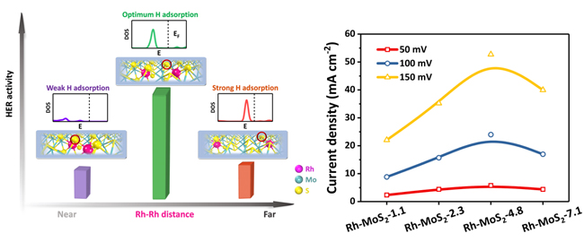 近日,大連化物所催化基礎國家重點實驗室二維材料與能源小分子轉化創新特區組(05T6組)鄧德會研究員、于良副研究員團隊提出二維硫化鉬(MoS2)限域銠原子的距離協同效應,利用銠單原子之間的距離來調控二維MoS2面內硫原子的電子結構和催化活性,從而實現高效電催化析氫(HER)性能。該工作為深入認識二維MoS2限域單原子的催化活性調控機制以及設計新型高效電解水析氫催化劑提供了新思路。