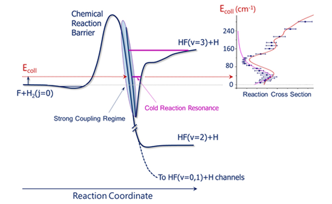 HF+H反應是星際化學中產生HF分子的重要過程。但是F+H2反應具有1.8 kcal/mol高度的勢壘(629 cm-1),經典模型下在接近絕對零度時這個反應幾率是完全可以忽略的。楊學明團隊通過對現有H原子里德堡態標示時間飛渡譜的交叉分子束裝置進行了顯著改進,觀測到了反應溫度低至14 K(9.8 cm-1)時此反應仍然發生的證據,同時觀測到了約40 cm-1碰撞能的一個反應共振峰。進一步理論分析表明,F+H2在低溫時的反應性,是通過反應共振態所增強的隧穿效應而產生的,而不是通常簡單的隧穿效應,這也是在接近絕對零度下此反應仍然可以發生的原因。如果將共振態所導致的共振增強效應移除,F+H2(v=0,j=0)在10 K溫度以下的反應速率常數,會降低三個數量級以上(Nat. Chem.,11,744-749,2019)。