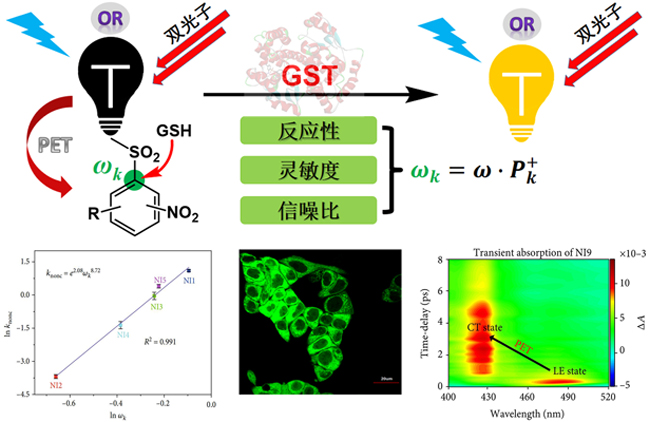 概念密度泛函理論(CDFT)從“分子的基態(tài)性質(zhì)由其基態(tài)電子密度所唯一確定”這一定理出發(fā),給出化學(xué)相關(guān)概念的確切物理定義及其表達(dá)式,從而可用于定量計(jì)算和衡量。本工作中,研究團(tuán)隊(duì)基于上述理論及GST酶促反應(yīng)的芳香親核取代(SNAr)反應(yīng)機(jī)理,創(chuàng)新性地將CDFT中的局域親電性指數(shù) k引入熒光探針的設(shè)計(jì)中,用于定量描述探針的背景反應(yīng)活性,進(jìn)而便于實(shí)現(xiàn)對反應(yīng)活性有的放矢地微調(diào)。非酶促反應(yīng)動力學(xué)測試結(jié)果表明,參數(shù) k可以準(zhǔn)確描述和預(yù)測探針分子與GSH的背景反應(yīng)活性;酶促反應(yīng)動力學(xué)測試結(jié)果則顯示, k值的大小總體上還可以代表靈敏度的強(qiáng)弱。值得注意的是,相對于酶促反應(yīng)所對應(yīng)的靈敏度kcat,非酶促反應(yīng)所對應(yīng)的背景噪音knonc對 k值更敏感,這證明了通過微調(diào) k達(dá)到降噪且保持高靈敏度的目的存在著可操作空間。此外,除了反應(yīng)/識別機(jī)制上的優(yōu)化,研究團(tuán)隊(duì)還通過飛秒瞬態(tài)吸收光譜實(shí)驗(yàn)和含時(shí)密度泛函理論計(jì)算證實(shí),體系中的光致電子轉(zhuǎn)移(PET)過程在發(fā)光機(jī)制上對低背景噪音有所貢獻(xiàn)。該研究為基于SNAr反應(yīng)的熒光探針或藥物分子的半定量設(shè)計(jì)提供了一種新思路。
