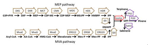 萜烯類化合物在食品、醫藥、化妝品、香料、生防等行業有廣泛的用途。近年來,萜烯類化合物因其加氫產物在生物燃料領域的潛在應用價值而受到越來越多的關注。萜烯類化合物傳統的生產方式是從天然植物中提取或者化學合成,但是這兩種方法存在產量較低、能耗高、操作流程復雜、易產生污染等問題。隨著合成生物學的發展和開發綠色能源的迫切需求,利用工程微生物和可再生糖來生產萜烯類化合物已成為新的研究熱點。青島能源所生物基材料組群精細化學品研究組長期從事生物合成萜烯類化合物的研究工作,并在蒎烯、檜烯、松油烯等化合物的生物合成方面取得了一系列重要進展(圖1)(Biotechnology for Biofuels 2013, 6:60; Microbial Cell Factories 2014, 13:20; RSC Advances 2018, 8:30851)。