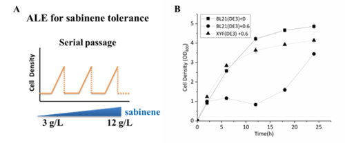 A利用逐漸提高培養基中檜烯濃度的定向馴化(Adaptive laboratory evolution,ALE)策略獲得大腸桿菌檜烯耐受性菌株;B 馴化菌株XYF(DE3)和未馴化菌株BL21(DE3)在含有或不含檜烯的培養基中的生長狀況