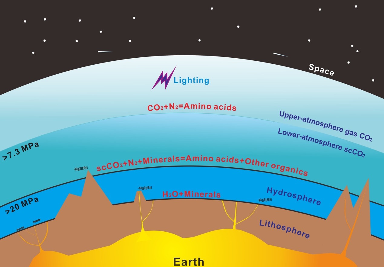 地球生命起源與初始有機(jī)質(zhì)形成一直廣受關(guān)注。生物學(xué)研究表明超嗜熱菌很可能是地球上生命的共同祖先,因此熱液系統(tǒng)一直被認(rèn)為與生命起源密切相關(guān)。但是熱液流體中缺少合成氨基酸的關(guān)鍵元素——氮,這是早期生命起源于熱液假說最致命的問題。而此次在深海熱液區(qū)發(fā)現(xiàn)的超臨界二氧化碳流體大量富集氮?dú)猓瑸樵缙诘厍驈臒o機(jī)到有機(jī)的過程提供了絕佳的反應(yīng)介質(zhì)。近期有實(shí)驗(yàn)表明在超臨界二氧化碳和礦物的參與下,從H2O-CO2-N2體系中可以合成四種氨基酸包括丙氨酸、甘氨酸、天冬氨酸和精氨酸。由此作者提出了一個(gè)新的早期地球生命起源模型。月球形成后的幾百萬年間原始大氣逐步形成,此時(shí)的原始大氣中含有數(shù)百大氣壓的水蒸氣和二氧化碳,以及氮?dú)獾?。在原始海洋形成后,?dāng)溫壓條件大于31 C和7.3MPa時(shí),二氧化碳將以超臨界流體相態(tài)存在,因此在地球表面存在超臨界態(tài)的二氧化碳層。在水圈與大氣圈的交界面上,氮?dú)夂偷V物微??梢员怀砻艿某R界二氧化碳所吸附。超臨界二氧化碳、水、氮?dú)庠诘V物顆粒的催化下,形成了初始的有機(jī)物氨基酸等物質(zhì),從而完成了從無機(jī)到有機(jī)的轉(zhuǎn)化,并產(chǎn)生了生命體必須的氨基酸等有機(jī)大分子。