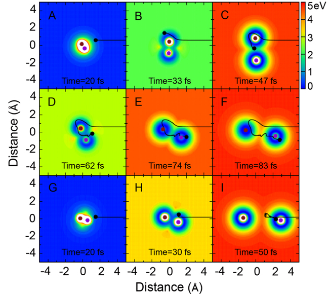 進一步采用經典軌線理論分析表明,其中一條反應途徑對應于通常所熟知的直接反應過程,如下圖G至I所示。而另外一條反應途徑對應于一條類似于roaming機理的反應過程,如圖A至F所示。由于這兩條反應途徑,剛好以相反的方向圍繞于H+HD反應勢能面上的錐形交叉,所以它們的干涉圖樣必須采用非絕熱耦合的勢能面來模擬計算才可以,這也體現了這個體系反應過程中的幾何相位效應。尤其有趣的是,在所研究的碰撞能范圍,通過漫游機理而發生的反應只占全部反應性的0.3%左右。而如此微弱的小部分反應性,能夠清晰地被理論和實驗所揭示出來。