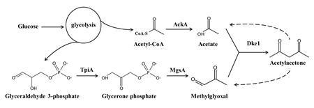 圖1 本研究提出的乙酰丙酮生物合成途徑(實線代表合成途徑,虛線代表降解途徑)